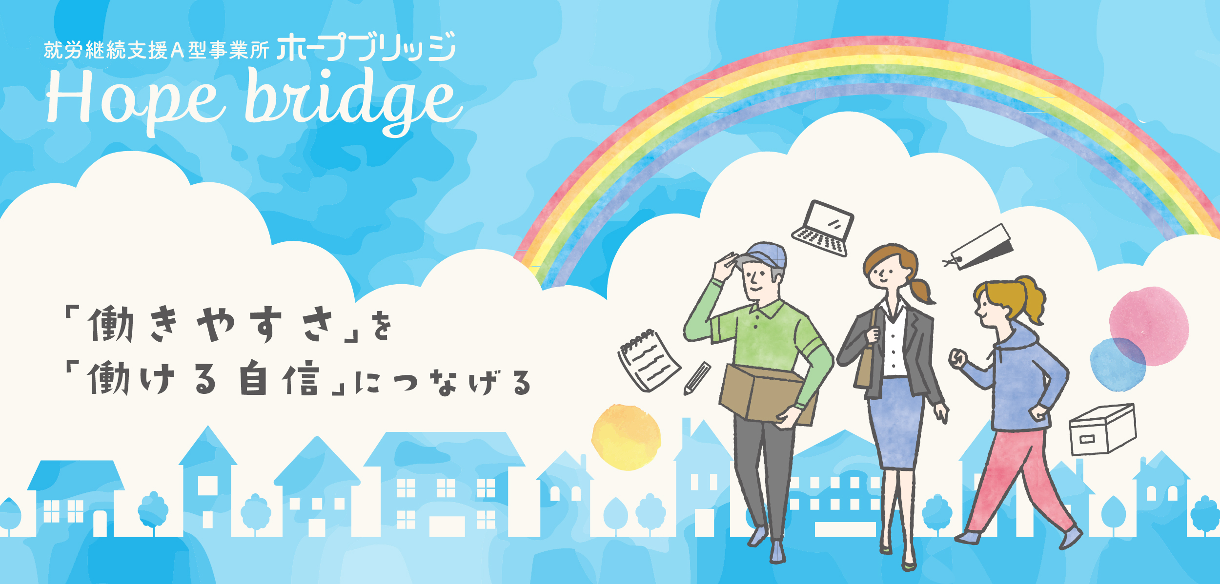 就労継続支援A型ホープブリッジでは、障害があるみなさま一人ひとりの不安や悩みに丁寧に向き合います。「働きやすい環境」を整え、働くことに対する自信をつけることからスタートしましょう!個性や職業適性を見極め、自分らしく働けるように全力でサポートします。