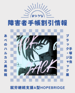 【障害者手帳割引情報⭐️】ブラックジャック展|あべのハルカス美術館こんにちは、利用者Mです。 今日は障害者手帳で利用できるお得な割引情報をご紹介します! 私が持っている障害者手帳は精神障害者保健福祉手帳2級です。 more